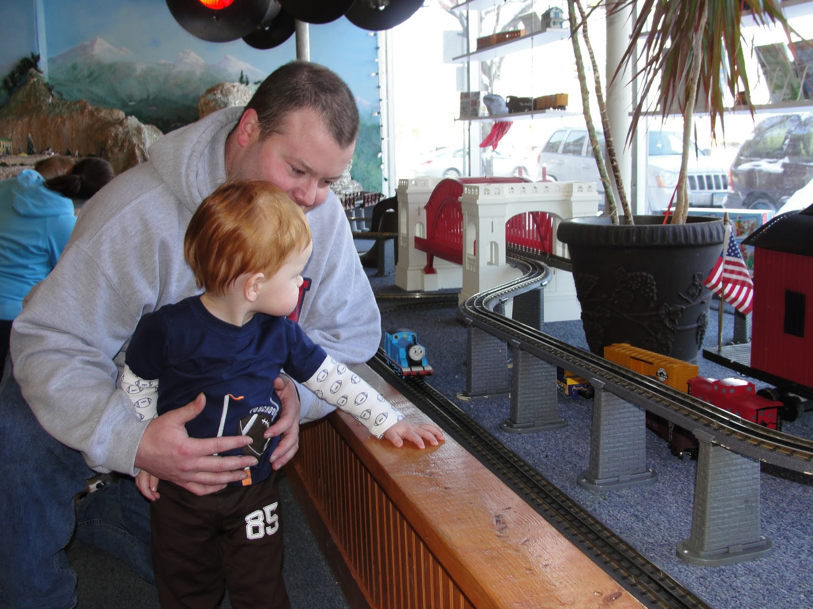 We headed to Choo Choo Bob's train store Saturday morning and had a BLAST! For the past few months Ben has been in LOVE with Thomas the Train and Chuggington so this was right up his alley!! And boy was it ever!! At the front of the store there were the electric Lionel trains and wouldn't you know, there was Thomas leading the pack! Ben's eyes were like saucers as he watched the trains go round and round the track.